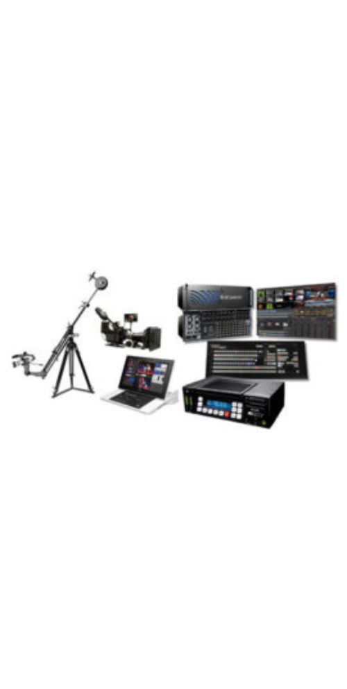 • Monitores profissionais, câmeras PTZ para transmissão ao vivo e sistemas de gravação.